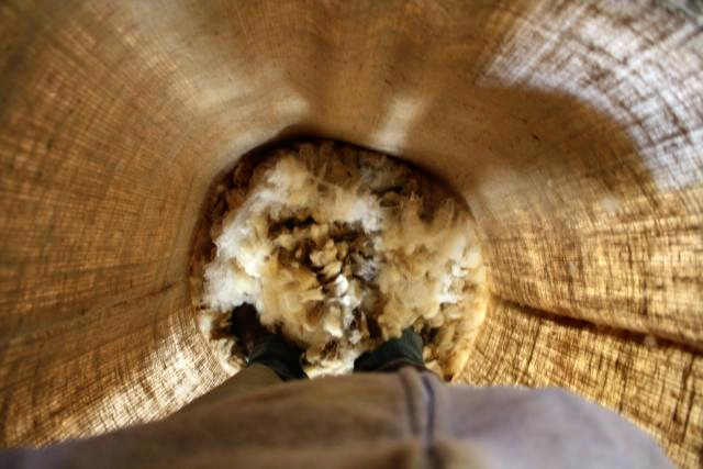 Sheep are usually sheared once a year, in the spring, before hot weather sets in. Many choose to shear before lambing starts because it creates a cleaner environment for the lambs and also keeps the fleeces cleaner. In earlier days the wool is placed in large bags for transporting to the buyer. As 8 foot-long bags would hang from a stand, “wool trompers” would jump into the bag after every few fleeces to pack the wool tightly. Today most wool is packed in large bales using a wool press.