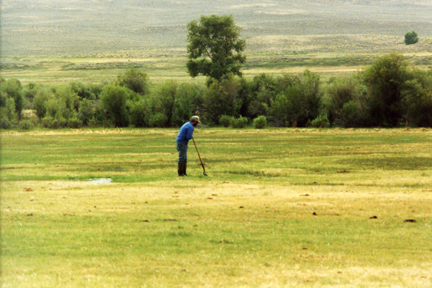 Once the water is let down the main irrigation ditches from the head gates on the rivers and creeks, it has to be let out into the scatter ditches. From the scatter ditches, the water is spread over the meadow. Little dams and dikes are built to send the water everywhere. This is an art, knowing how to get the water to flow over the land. A good irrigator knows every inch of his land and how the water moves on it. This type of irrigation is called flood irrigation.