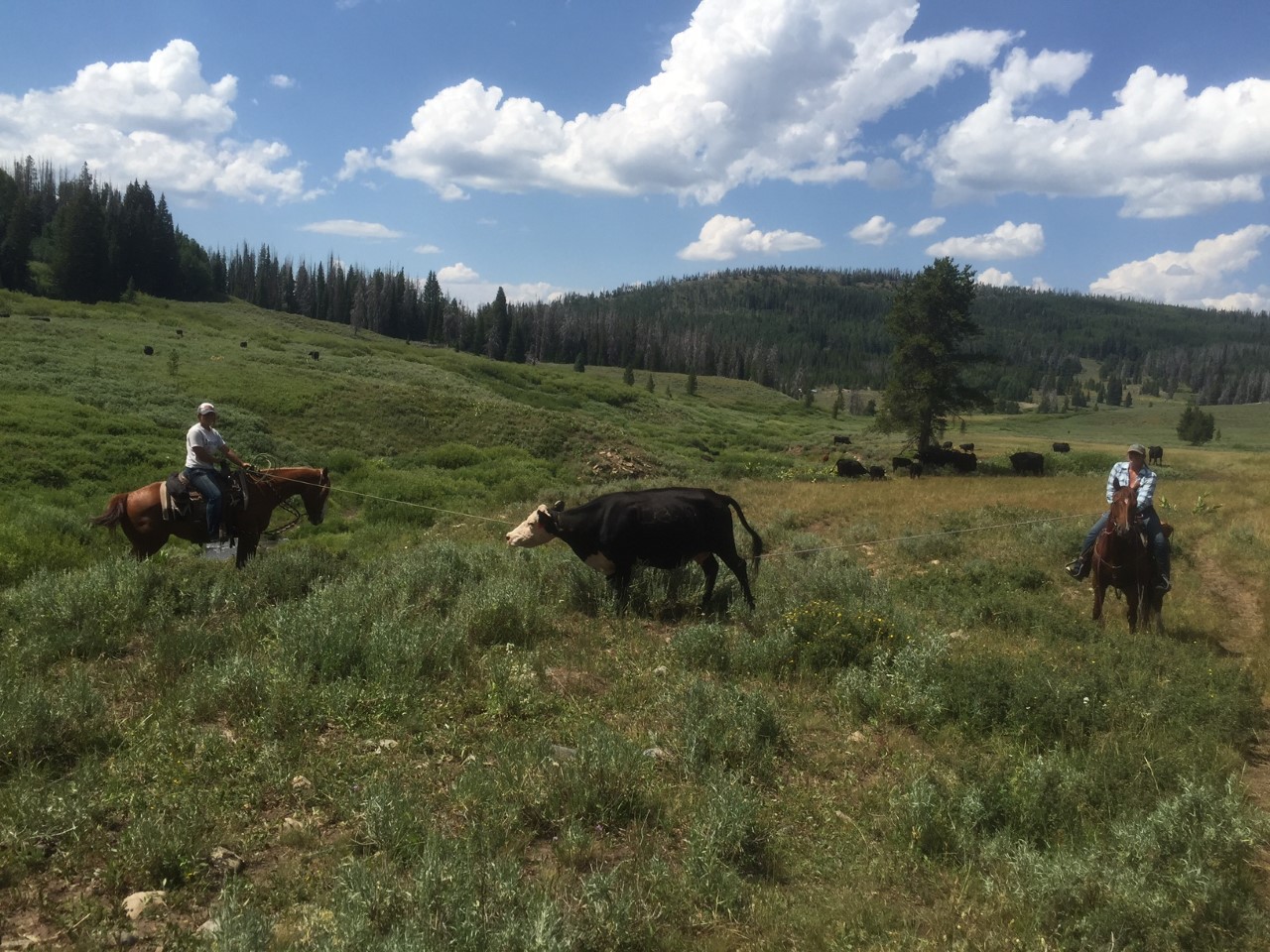 One day, when we weren’t putting cows back into buck camp, Chad, Nikki and I went up to the Colorado forest where we moved the group of cows in Big Red Park to Silver City. The cows moved fairly well! When we got to Silver City, there was a mother cow and a calf that needed to be doctored. While we were waiting for Chad to get back with the pickup, Nikki had me practicing heeling so I could help her rope the cow while Chad gave the cows medicine. Nikki had me roping since Chad didn’t bring a horse that he could rope off of! I was okay with this because I got the opportunity to rope and caught after my 3rd loop! WOO! This was the first time I roped off of a horse!