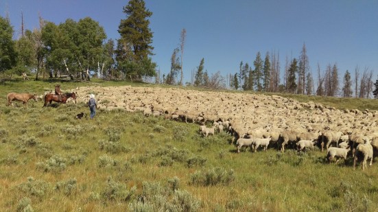 It’s hard to believe that a week has already flown by at the Ladder Ranch! We started out the week by trailing some more cattle to the forest. Most of them went okay, but there were a few that decided to take to the brush! After a lot of hard riding, I just had to leave them be and go help with the other bunch. The next few days were taken up with driving to and from the Environmental Stewardship Tour. We had a good time and got to see some pretty country. When we got back, we had a big docking to get through. We docked well over 1200 lambs and finished fairly early in the afternoon. Back at the ranch, we had to pick up some little bales in the field so that we could move the sprinklers out of the way for the hay contractor. We wrapped up the week with another small docking and counting sheep for the forest. The Ladder Ranch marks about 40 ewes with large paint numbers and about ten have bells put on their neck. The idea behind this is to provide the herders with “marker sheep” to keep track of. If one of the marked sheep is missing, chances are that they have some more sheep with them. I spent several hours on Saturday hauling round bales out of the field to the stackyard. After that project was done, we took the tractor down and put in concrete blocks in the river to turn irrigation water down the ditch. Before the night was through, I baled up about 170 more small bales of grass hay. It was a busy few days, but it sounds like next week will be not as chaotic. More haying and general ranch work coming up!