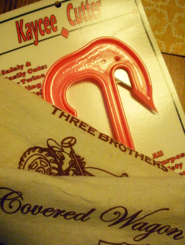 The Kaycee Cutter was invented by Tony Armstrong who ranches with his wife Milisa and their 3 boys in Kaycee, Wyo. It is made right in Wyoming and packaged and shipped from the ranch. Milisa also has a food blog, www.missinthekitchen.com, where she also sells these 100% unbleached cotton flour sack towels with printed designs.